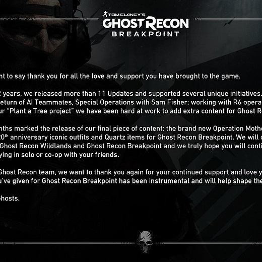 “The last four months marked the release of our final piece of content: the brand new Operation Motherland mode, tons of new items including 20th anniversary and Quartz items [NFTs] for Ghost Recon Breakpoint. We will continue to maintain our game servers for both Ghost Recon Wildlands and Ghost Recon Breakpoint.”