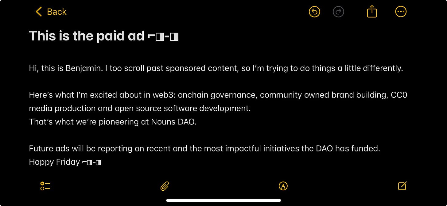 After extensive discussions with my close friend Bru, we’ve decided to restart and maintain the newsletter together, ensuring we can send it out weekly. To make this sustainable, we’ve partnered with Benjamin, studio director at eponymous studio and Nouns Town ⌐◨-◨ host, who will sponsor the newsletter over the coming weeks.